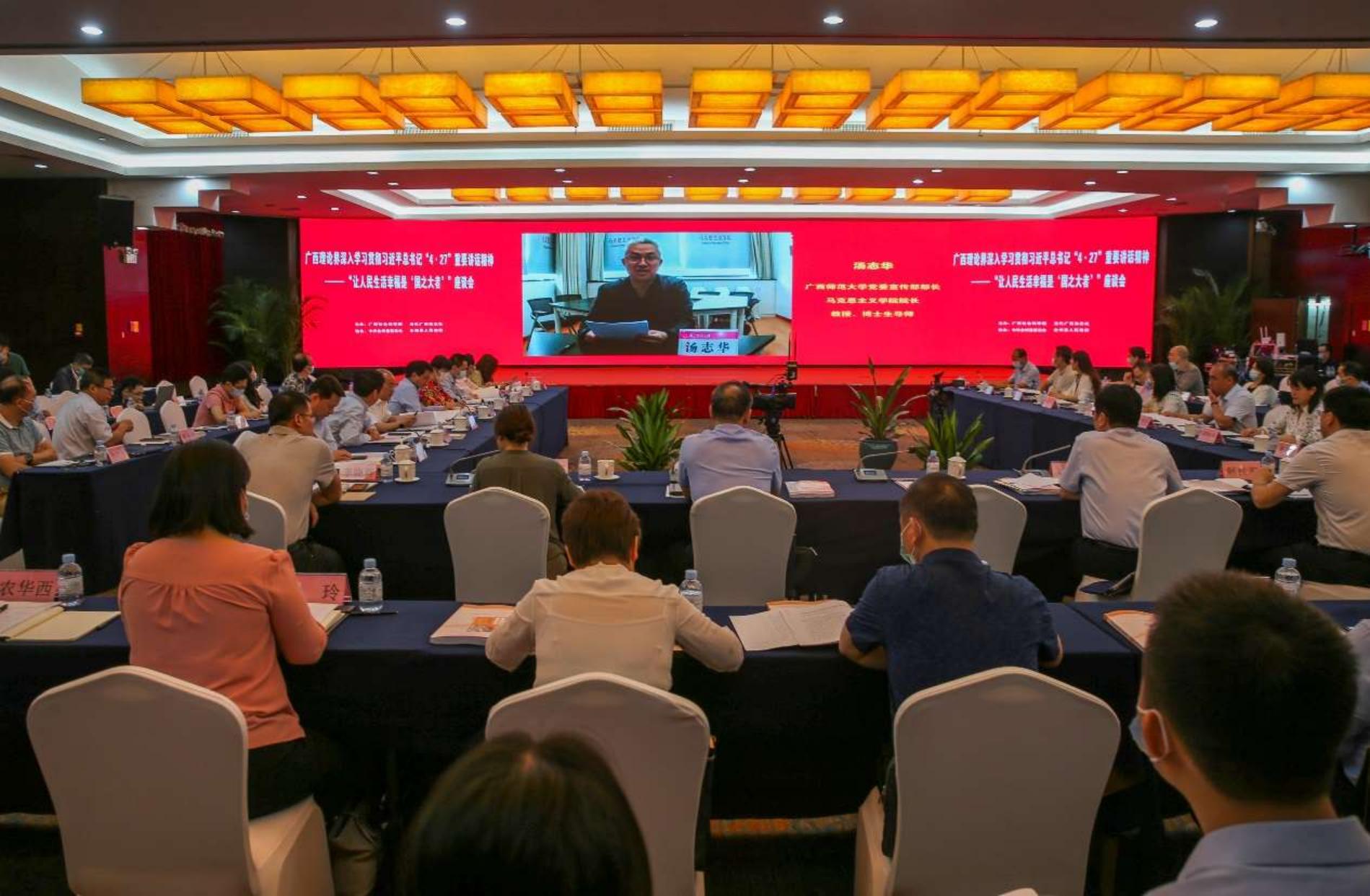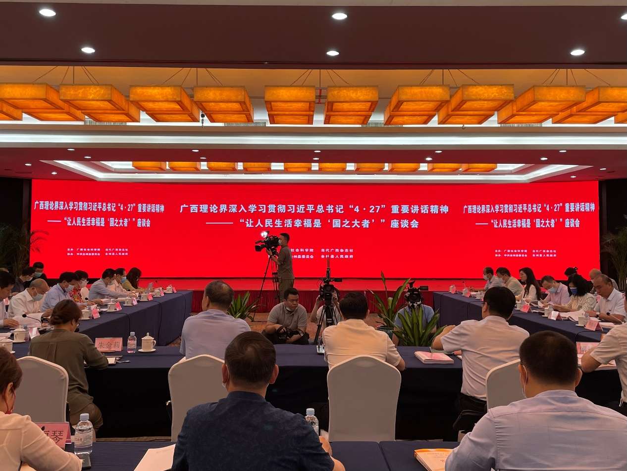 4月24日,广西理论界以“让人民生活幸福是‘国之大者’”为主题,分别在南宁和桂林全州县召开座谈会。广西区内高校马克思主义学院、党校(行政学院)、干部学院、科研院所的专家学者代表80多人出席了会议。广西壮族自治区党委宣传部副部长赵勇富在主会场出席会议并致辞。当代广西杂志社社长、总编辑刘波主持主会场会议。