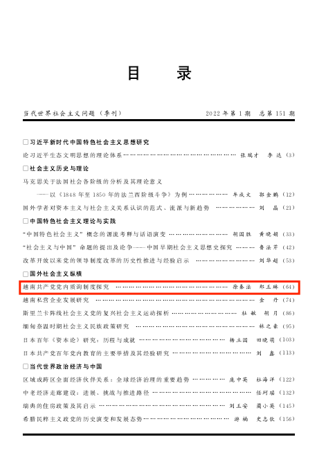 我院教师徐秦法教授、博士研究生郑玉琳在《当代世界社会主义问题》(2022年第1期)上发表学术论文《越南共产党党内质询制度探究》。《当代世界社会主义问题》是由教育部主管,教育部人文社科重点研究基地——山东大学当代社会主义研究所主办,以介绍和研究当代世界社会主义主要理论和实践问题为主要内容的专业学术刊物。为CSSCI中文社会科学引文索引(2019—2020)来源期刊、北京大学《中文核心期刊要目总览》来源期刊。