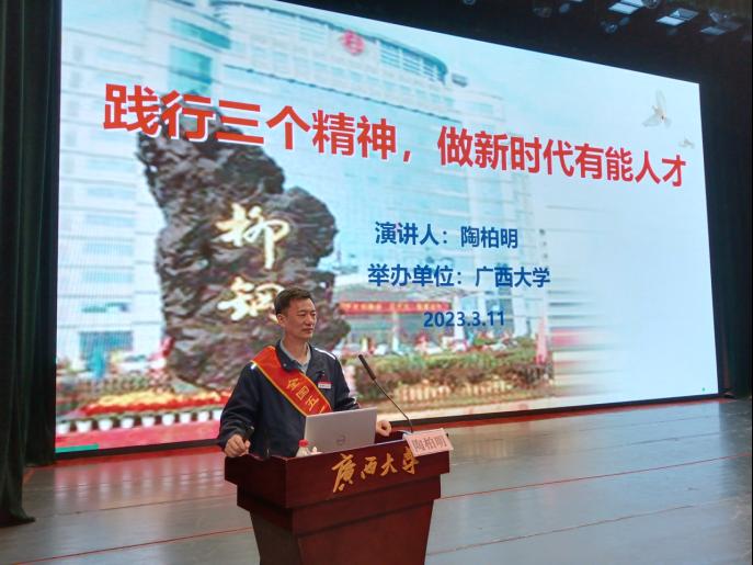 2023年3月11日,在我校大礼堂举行的“形势与政策”课程专题教学报告会上,柳州工匠学院-柳钢集团工匠学校执行校长、全国五一劳动奖章获得者、百名全国劳动模范服务团,百名广西产业工人党的二十大精神宣导团,柳州市劳模工匠宣讲团成员陶柏明先生为到场师生做了题为“践行三个精神,做新时代有能人才”的报告。