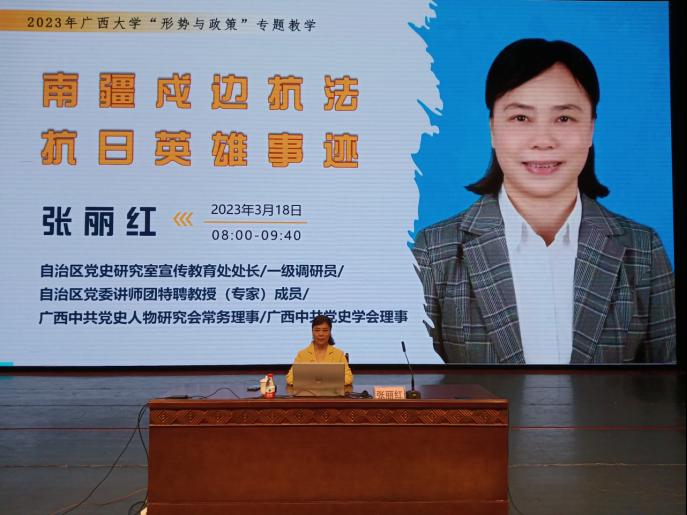 2023年3月18日,马克思主义学院在大礼堂举行了“形势与政策”课程专题教学报告会。自治区党史研究室宣传教育处处长、一级调研员,2022-2024年度自治区党委讲师团特聘教授(专家)张丽红同志为在场的师生做了题为“南疆戍边抗法抗日英雄事迹”的报告。