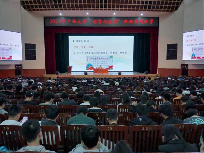 2023年4月1日下午,我校大礼堂举行的“形势与政策”课程专题教学报告会上,中共广西区委党校科学社会主义(政治学)教研部教授,自治区党委讲师团特聘教授李肇忠同志为到场师生做了题为“推进文化自信自强,铸就社会主义文化新辉煌”的报告。