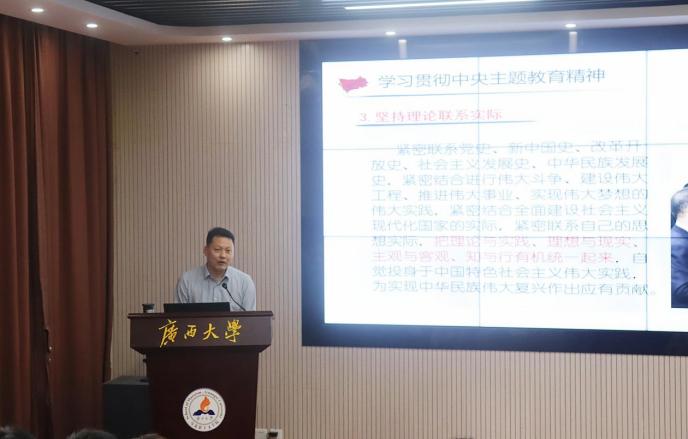在授课中,徐秦法以《学思用贯通 知信行统一——牢牢把握“学思想、强党性、重实践、建新功”的总要求》为题,从习近平新时代中国特色社会主义思想的世界观与方法论入手,结合马克思主义的立场、观点和方法,向学员们深刻阐释了开展学习贯彻习近平新时代中国特色社会主义思想主题教育的重大意义,系统讲解了主题教育的目标与要求,强调全体学员要坚持原原本本读原著,认认真真学原文,全面学习领会习近平新时代中国特色社会主义思想,把握好这一思想的世界观、方法论,坚持好、运用好贯穿其中的立场观点方法,自觉把理论与实践、理想与现实、主观与客观、知与行有机统一起来,积极投身于中国特色社会主义的伟大实践。课上,徐秦法还运用大量的数据和翔实的案例向大家生动讲述了“一带一路”倡议和“人类命运共同体”理念对中国发展和世界繁荣作出的重要贡献。