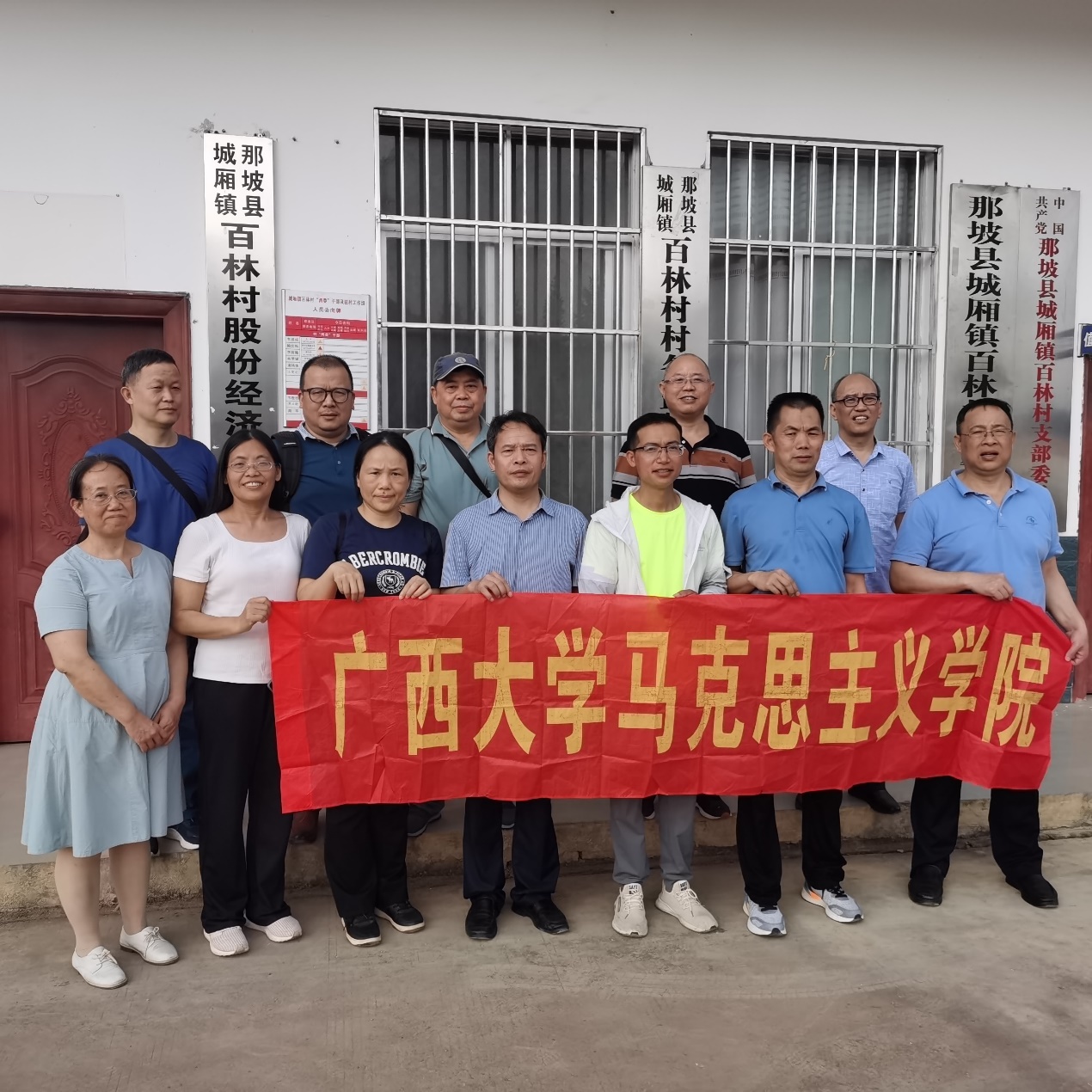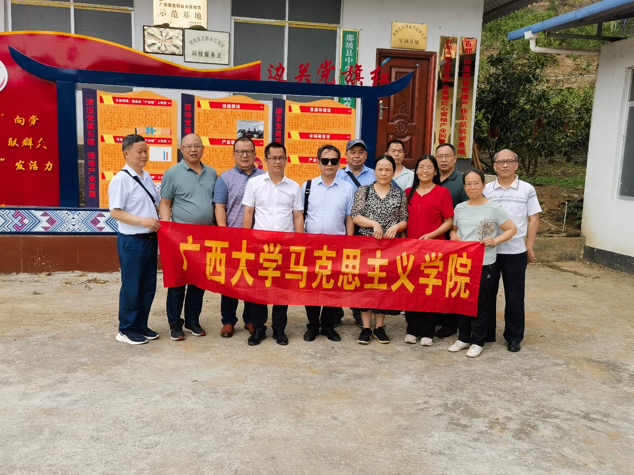 为了扎实推进区级一流课程《毛泽东思想和中国特色社会主义理论体系概论》建设,广西大学马克思主义学院概论教研部教师在学院副院长梁建新教授带领下,于2023年5月20日至21日赴广西那坡县城厢镇百林村、百都乡红坭村红心蜜柚产业基地、乡政府党群服务中心等地考察乡村振兴与推进共同富裕、基层党建与乡村治理等工作。