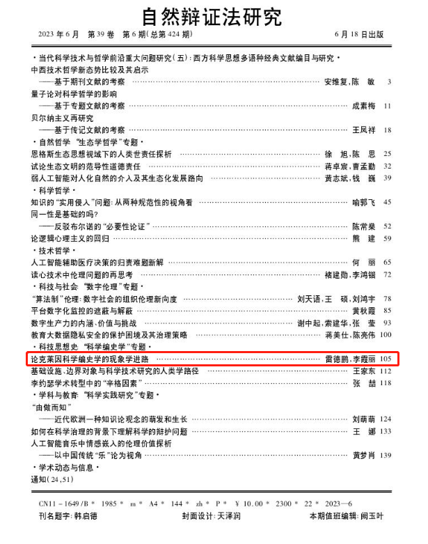 我院教师雷德鹏、博士研究生李霞丽在《自然辩证法研究》(2023年第6期)上发表理论文章《论克莱因科学史编史学的现象学进路》。
