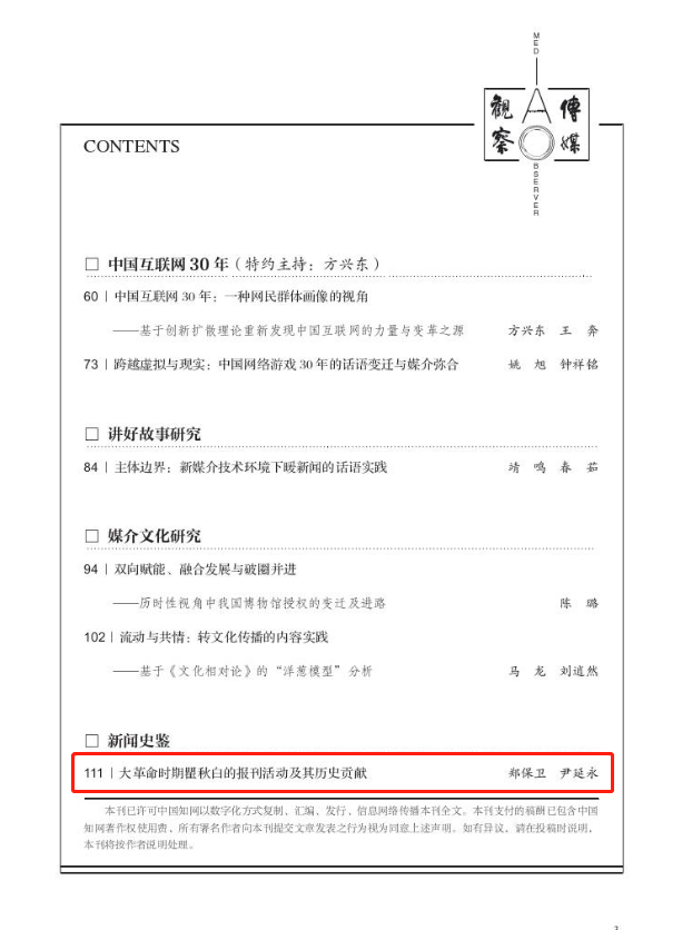 我院教师郑保卫、博士研究生尹延永在《传媒观察》(2023年第1期)上发表理论文章《大革命时期瞿秋白的报刊活动及其历史贡献》。