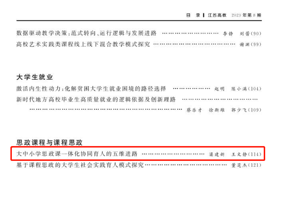 我院教师梁建新、硕士研究生王文静在《江苏高教》(2023年第8期)上发表理论文章《大中小学思政课一体化协同育人的五维进路》。