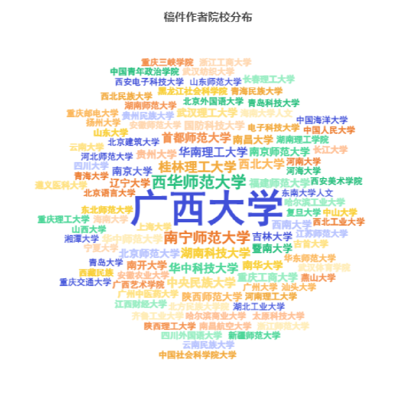 从院校分布来看,本分论坛共收到来自全国100余所高校和科研院所的青年学子的投稿。其中,投稿数量位于前十的高校分别为广西大学、西华师范大学、南宁师范大学、桂林理工大学、湖南科技大学、华南理工大学、华中科技大学、首都师范大学、西北大学、中央民族大学。此外,还收到了复旦大学、国防科技大学、中山大学、吉林大学、四川大学、暨南大学等众多高校学生的来稿。