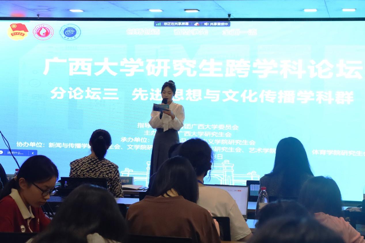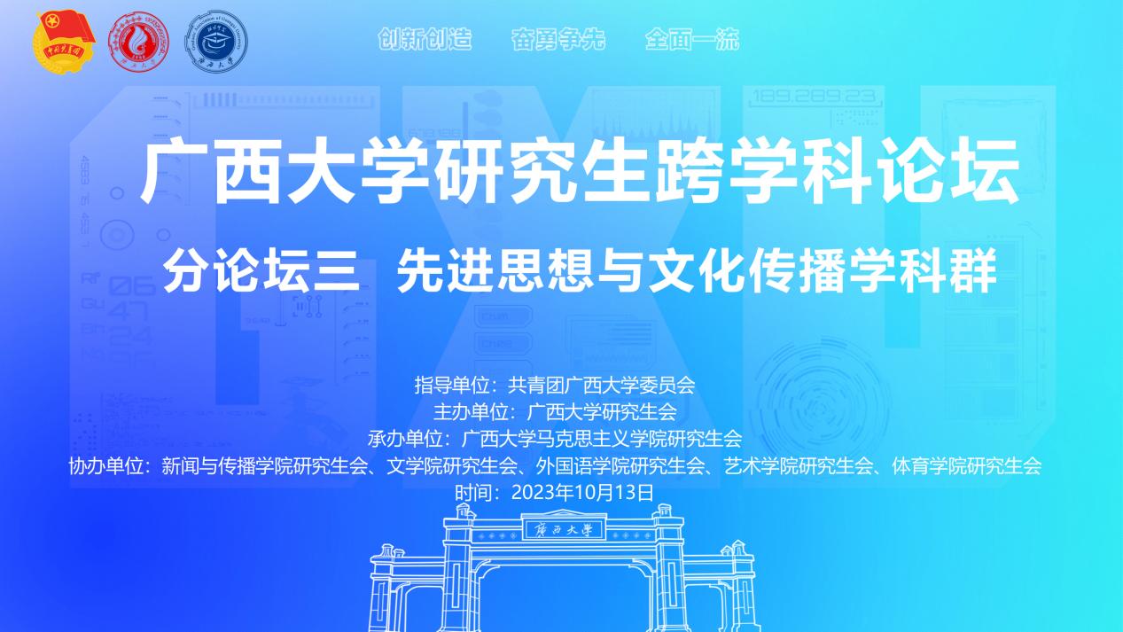 为深入开展学习贯彻习近平新时代中国特色社会主义思想主题教育,进一步推动我校“双一流”建设,营造学科交叉融合良好氛围,推进落实我校学科集群发展模式,在校团委的具体指导下,广西大学研究生会主办以“研究生,学科交叉融合,“双一流”建设”为主题的研究生跨学科论坛,我院研究生会作为承办单位成功举办了广西大学首届研究生跨学科论坛“分论坛三”先进思想与文化传播学科群。