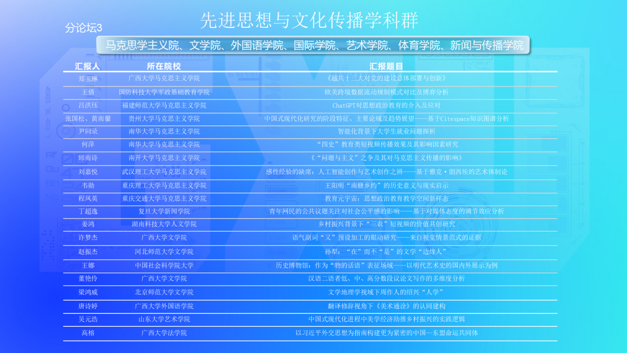 分论坛三以“先进思想与文化传播学科群”主体,来稿作者来自不同的学院,囊括了马克思主义学院、文学院、新闻与传播学院、外国语学院、艺术学院、法学院、体育学院等众多学院。