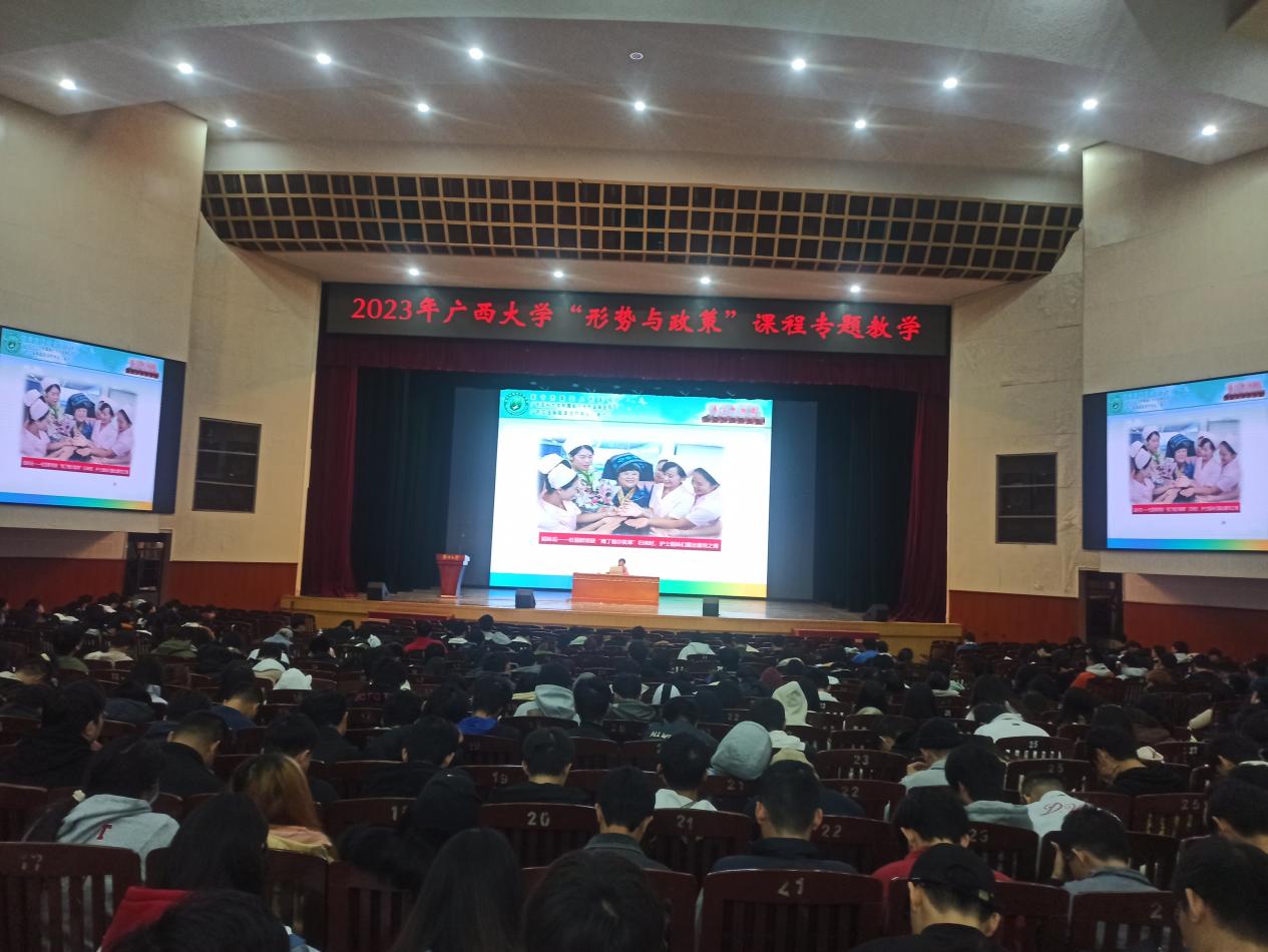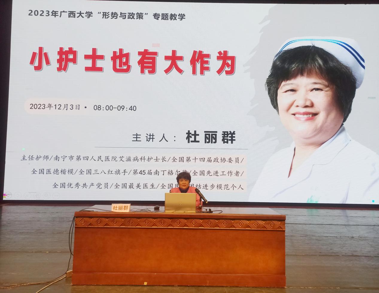 12月3日,2023年广西大学“形势与政策”专题教学报告会在我校大礼堂如期举行。此次报告会特邀中国共产党第十九次全国代表大会代表、全国第十三届政协委员、南宁市第四人民医院艾滋病科护士长、主任护师杜丽群做“小护士也有大作为”的主题报告。