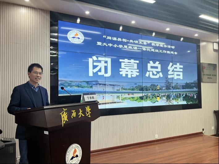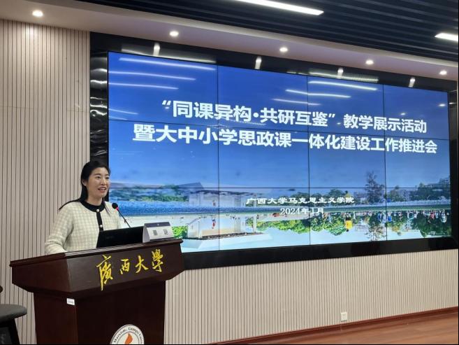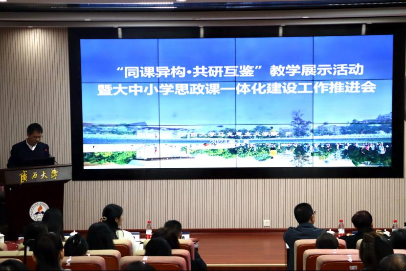 为切实发挥高校示范引领作用,推动形成全区大中小学思政课一体化工作新格局。1月20日—21日,广西大学作为全区大中小学思政课一体化共同体建设牵头高校,组织本共同体成员单位在广西大学马克思主义学院101报告厅开展了“同课异构·共研互鉴”教学展示活动暨大中小学思政课一体化建设工作推进会。