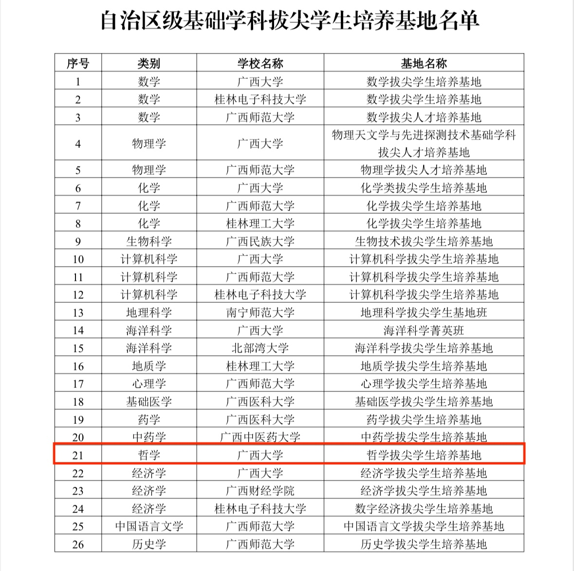 近日,自治区教育厅公布了自治区级基础学科拔尖学生培养基地名单,我院“哲学拔尖学生培养基地”成功入选。