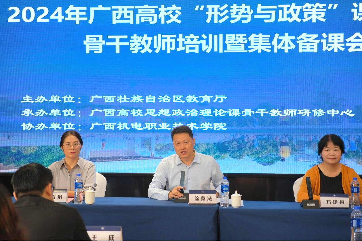 为全面贯彻党的教育方针,落实立德树人根本任务,进一步加强我区“形势与政策”理论课教师队伍建设,11月16日至18日,由自治区教育厅主办,广西高校思想政治理论课骨干教师研修基地(广西大学)承办,广西机电职业技术学院协办的2024年广西高校“形势与政策”课骨干教师第二期培训暨集体备课会在南宁成功举办。中共中央党校(国家行政学院)科学社会主义教研部主任秦刚、吉林大学马克思主义学院教授王贤卿、宁夏大学阿拉伯学院院长李绍先、国家社会科学基金学科评审组专家黎鹏、中国社会科学院大学教授潘金娥、中宣部《时事报告》杂志社湖南教学服务中心王成、广西大学马克思主义学院院长徐秦法出席开班仪式,仪式由梧州学院马克思主义学院党委副书记罗吉娟主持。