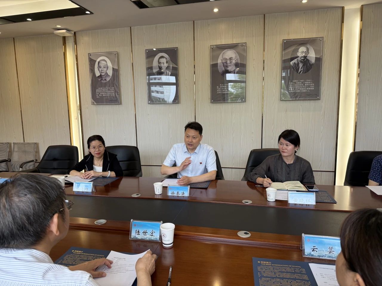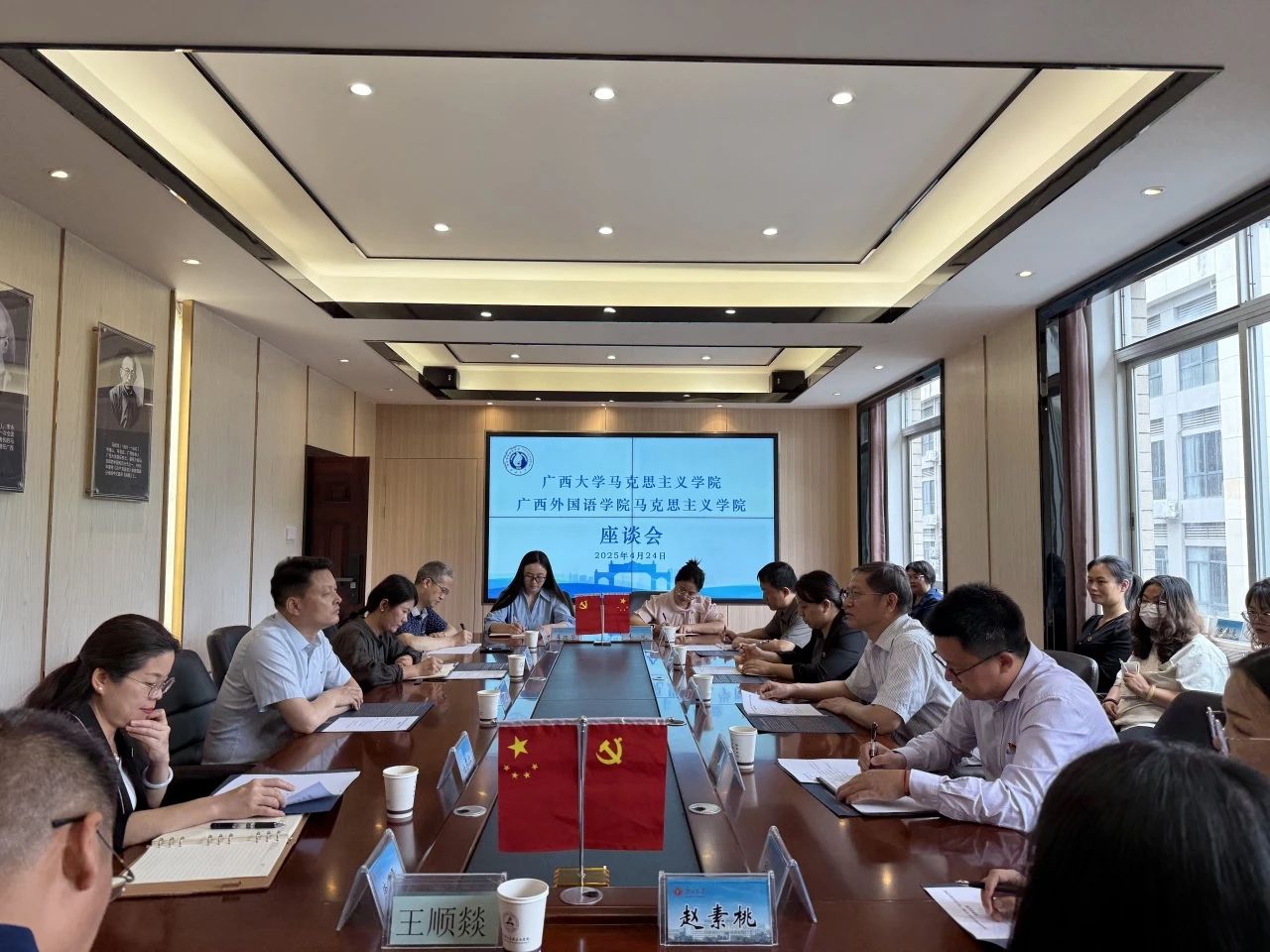 为推进学科交流合作,促进教育教学资源的共建共享,共同探索马克思主义学院高质量发展新路径,4月24日上午,广西外国语学院马克思主义学院院长陆世宏一行来我院调研交流。院长徐秦法、副院长陆秀红、副院长黄晓红、中国近现代史纲要教研部主任粟远辉等热情接待并参加座谈。双方围绕教师队伍建设、教学改革、学科建设以及人才培养等方面进行了深入的交流探讨。
