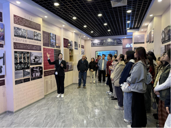在讲解员的带领下,师生们首先踏入了红色工运史陈列展馆。该展区分为伟大开端、山重水复、抗日烽火和天翻地覆四个篇章,以1919年至1949年以来中国共产党党史和中国工运史的重要历史交汇事件为脉络,通过文字、图片、视频等多种形式展示波澜壮阔、气象万千的党史、工运史画面,擦亮党的百年光辉历程中的“工运记忆”,让师生们能够直观地重温中国共产党领导工人运动的红色历程,接受精神洗礼。