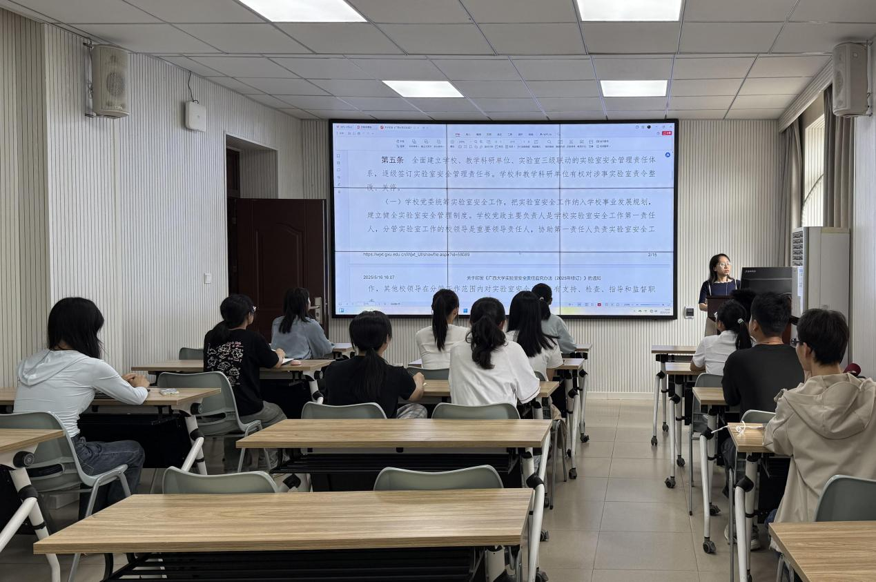 为严格贯彻落实《广西大学实验室安全责任追究办法(2025年修订)》,进一步加强学院实验室安全管理,强化师生责任意识,促进教学、科研工作持续健康发展。5月20日,马克思主义学院在106教室举行广西大学实验室安全责任意识的培训学习会议。学院实验室主任蒋钦主持会议,负责实验室安全管理的院领导黄晓红副院长、实验室工作相关教师、日常使用实验室的相关学生参与会议。