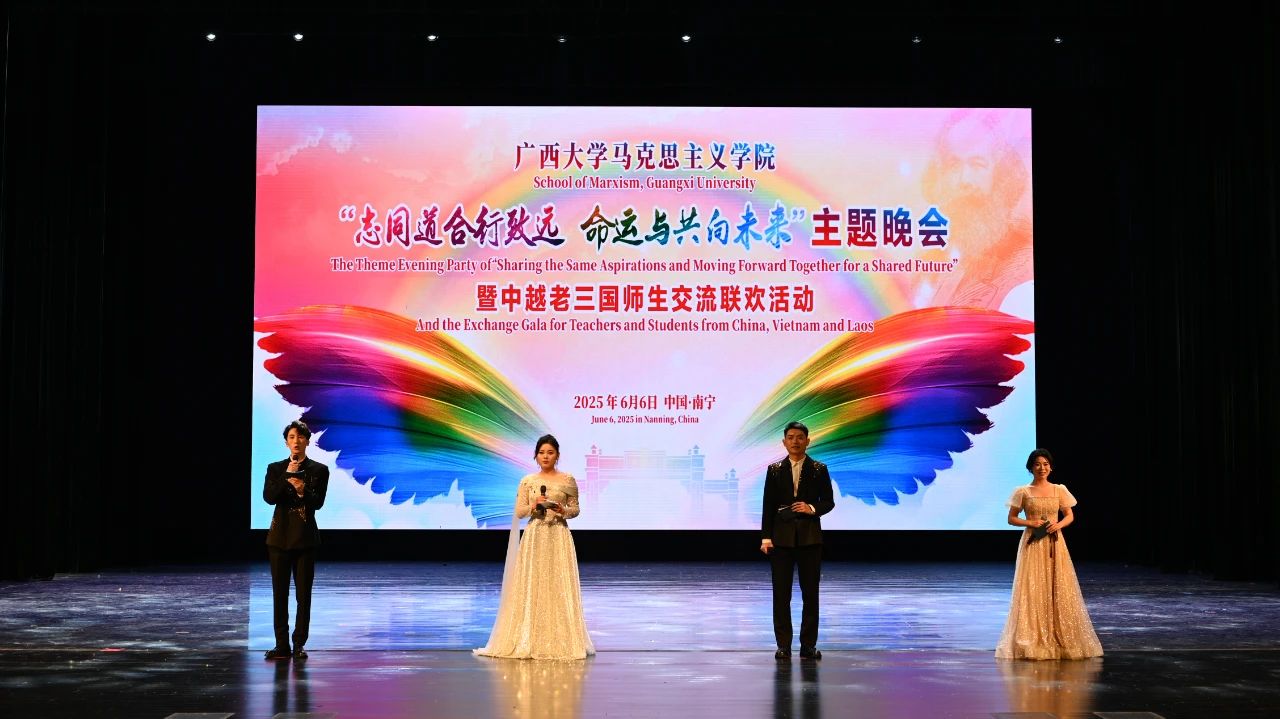 6月6日,我院在汇学堂成功举办“志同道合行致远 命运与共向未来”主题晚会暨中越老三国师生交流联欢活动,来自中国、越南、老挝的师生代表齐聚一堂,共同唱响构建人类命运共同体的新乐章。广西大学党委书记、马克思主义学院党委书记李国忠出席晚会并致辞。越共中央理论委员会委员、越南哲学协会常务副会长、越南社会科学翰林院原副院长范文德,老挝国立大学社会科学学院政治系主任西维莱·乔布汤,广西大学校长助理、马克思主义学院院长徐秦法,马克思主义学院党委常务副书记吴达慧出席晚会。
