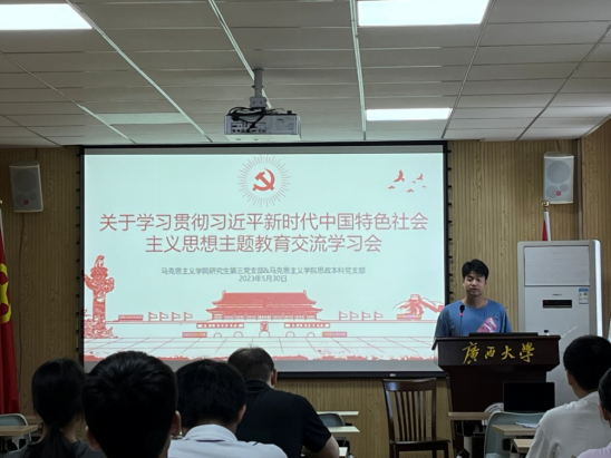 为深入贯彻落实习近平新时代中国特色社会主义思想,强化理论武装、筑牢思想根基,使支部党员进一步深刻领悟“两个确立”的决定性意义,增强“四个意识”、坚定“四个自信”、做到“两个维护”,5月30日下午,我院研究生第三党支部联合思政本科党支部在学院102教室召开了学习贯彻习近平新时代中国特色社会主义思想主题教育交流学习会,会议由研究生第三党支部副书记赵彦雪主持。