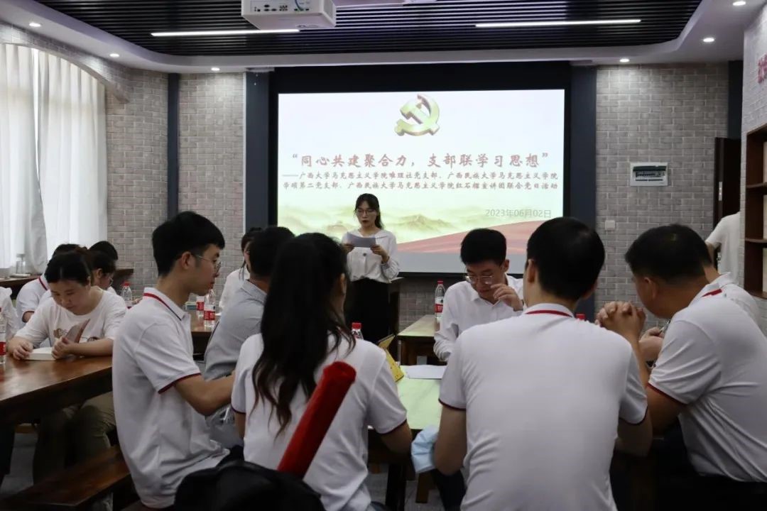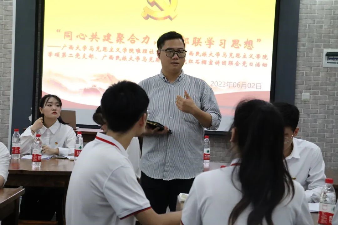 为深入开展学习贯彻习近平新时代中国特色社会主义思想主题教育,增强广西高校研究生党支部间的互动交流,6月2日,广西大学马克思主义学院唯理社党支部联合广西民族大学马克思主义学院学硕第二党支部、“红石榴”学生理论宣讲团共同开展了“同心共建聚合力,支部联学习思想”主题党日活动。广西大学马克思主义学院党委书记周瑞超、党委副书记李海波,广西民族大学马克思主义学院党委副书记高文涛参加了本次活动。