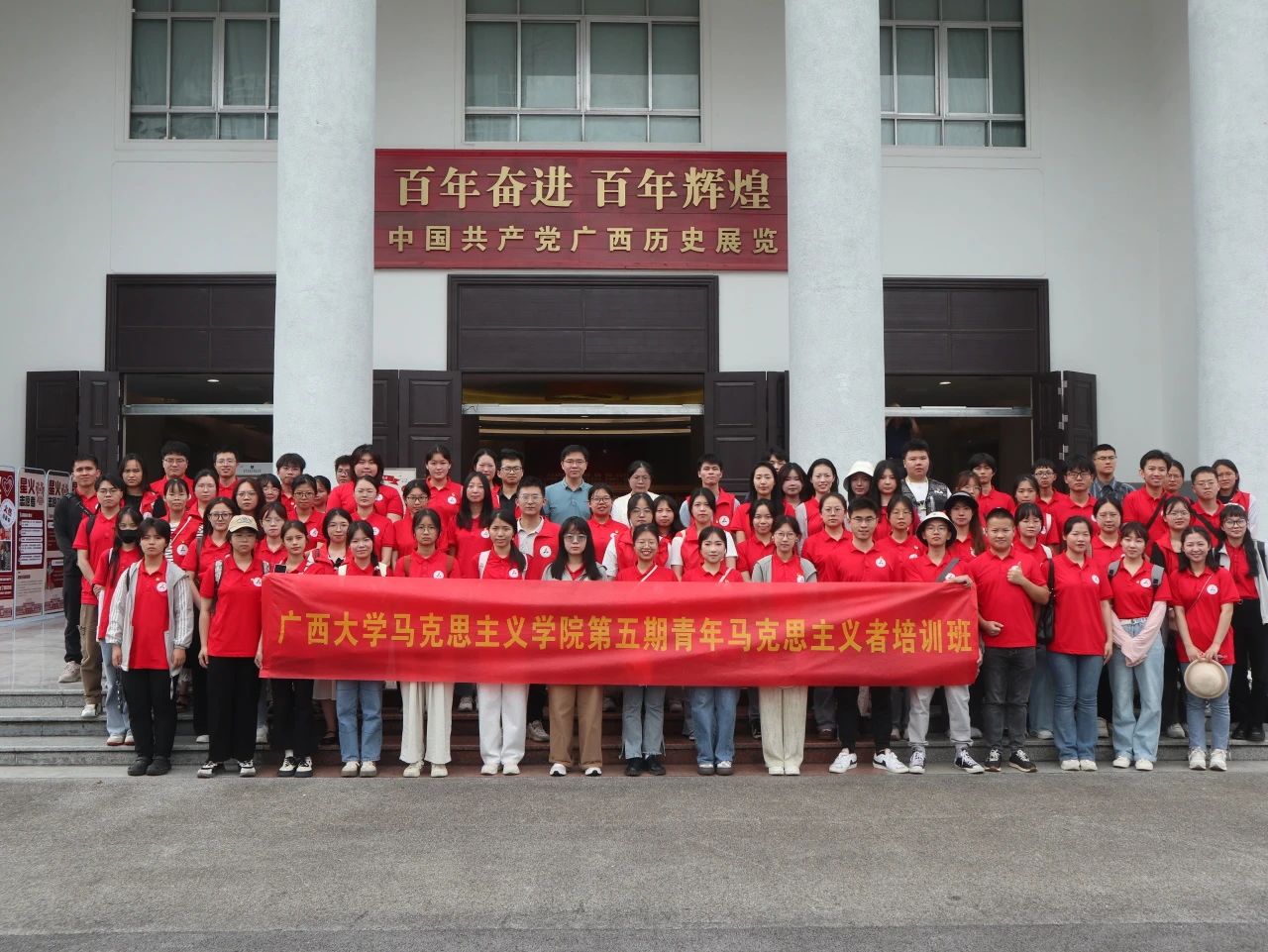 晴日暖风,早荷婷立。为充分利用好本土红色资源,引导同学们赓续红色血脉,涵养红色基因的担当使命,助力建设壮美广西,5月7日下午,马克思主义学院第五期青马班全体学员走进广西展览馆开展“感悟精神伟力,勇担时代使命”红色研学活动。
