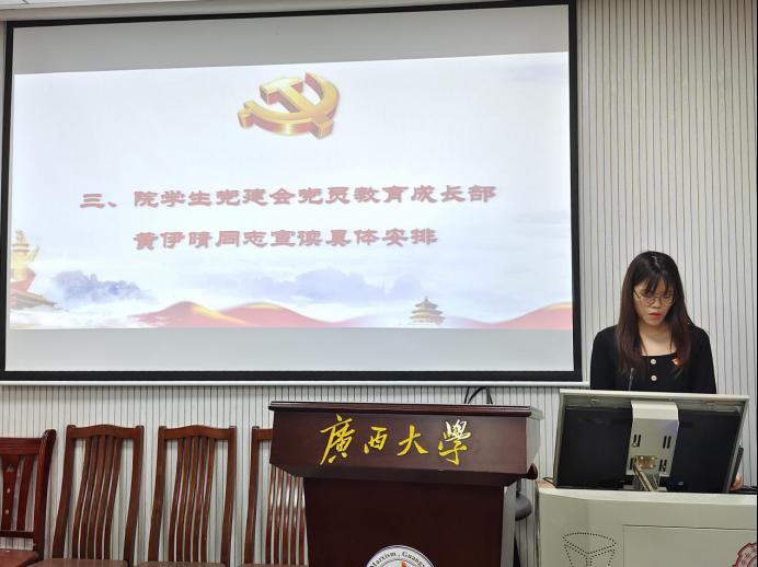 为深入学习贯彻习近平新时代中国特色社会主义思想和党的二十大精神,贯彻落实新时代党的建设总要求,切实提升党员发展质量,扎实有序组织做好发展对象培训工作,5月9日,我院举行广西大学党委党校马克思主义学院分校发展对象培训班开班仪式。培训班全体成员及学生党建工作委员会成员参加。开班仪式由党建会党员教育成长部负责人黄伊晴主持。