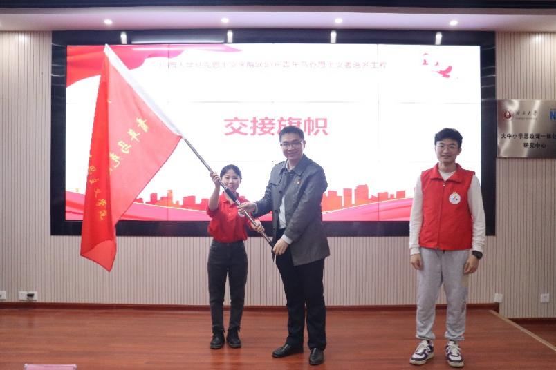 第三期青马班副班长杨雨鹭分享了一年来在青马班学习的收获与感悟,号召新一期青马班学员传承优良学风,集中思想精力,端正学习态度,全身心投入到培训中去。随后,虞文茜老师和莫凯洋老师分别为第三期青马班“优秀小组”及“优秀学员”颁发荣誉证书;紧接着,两期青马班班委进行了班旗交接,李海波老师为新一期青马班授旗。