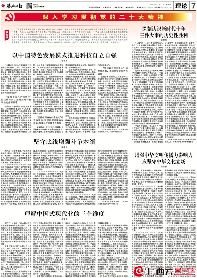编者按:广西大学具有马克思主义研究的光辉历史和优良传统。首任校长马君武先生于1906年将《共产党宣言》的纲领部分翻译成中文刊载于《民报》,20世纪30年代中后期,中共创始人之一李达先生和《共产党宣言》的第一个中文全译本翻译者陈望道先生都曾在广西大学任教。该校始终传承马克思主义研究传统,在党的创新理论研究上取得卓越成效。新时代十年来,该校马克思主义学院注重将马克思主义理论研究与实际相结合,聚焦研究基础理论重大现实问题,获国家级重大课题5项。目前,学校拥有马克思主义理论一级学科博士学位授权点,该学科已入选广西一流学科建设名单。为更好交流学习,本期理论版邀请该校5位国家级重大项目首席专家、博士生导师,聚焦党的二十大报告中的新观点、新论断、新思想,结合理论和现实问题,提出思考。敬请关注。