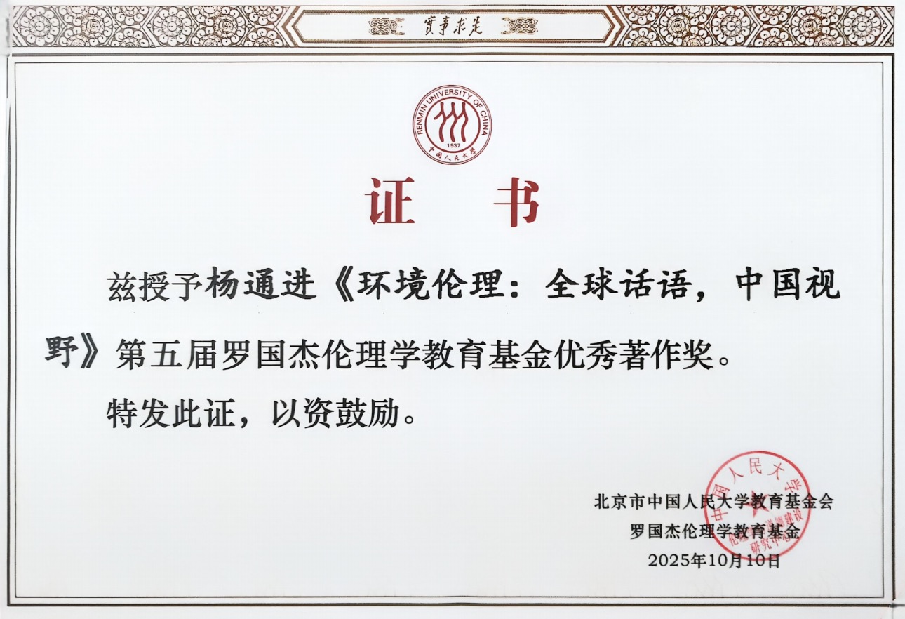 2025年10月12日,第五届国界论坛暨第五届罗国杰伦理学教育基金颁奖典礼在北京举行。我校杨通进教授的学术专著《环境伦理:全球话语, 中国视野》获第五届罗国杰伦理学教育基金优秀著作奖。该书初版于2007年由重庆出版社出版;修订版于2022年由贵州大学出版社出版,并入选“百年贵大学术精品文库”。