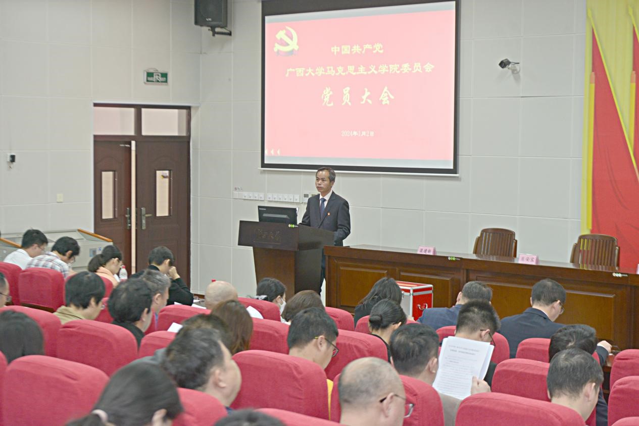 1月2日,中共广西大学马克思主义学院委员会党员大会在第六教学楼阶梯教室顺利召开。本次大会的主要任务是听取和审议上一届学院党委工作报告,书面审议上一届学院纪委工作报告和党费收缴使用管理情况报告,选举产生新一届学院党委委员和纪委委员。校党委组织部韦海老师代表校党委莅临大会进行指导。我院师生正式党员共202人参加了会议。